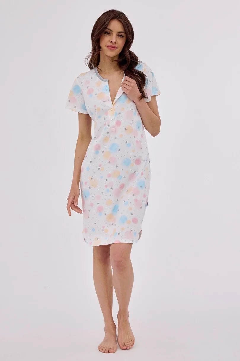 Dámské tričko s krátkým rukávem ze vzorované bavlny, kulatý výstřih, rozepínání, délka před kolena, mírně zaoblený spodní lem. Baleno v krabici.