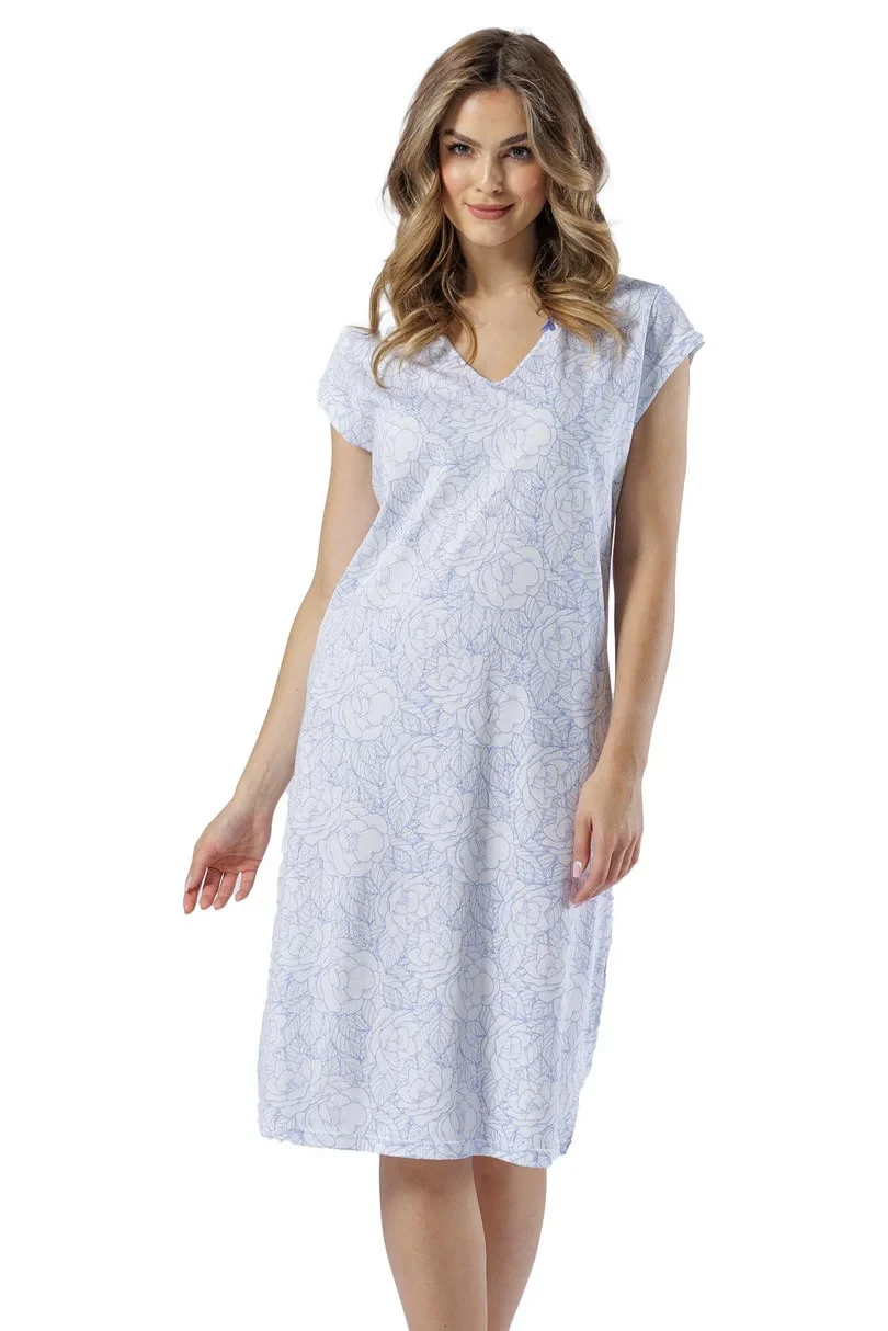 Dámské tričko s krátkým rukávem ze vzorované bavlny, s výstřihem a délkou ke kolenům.