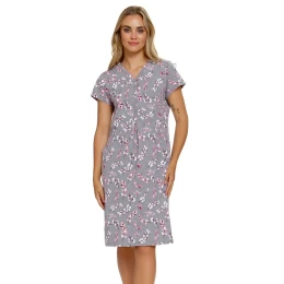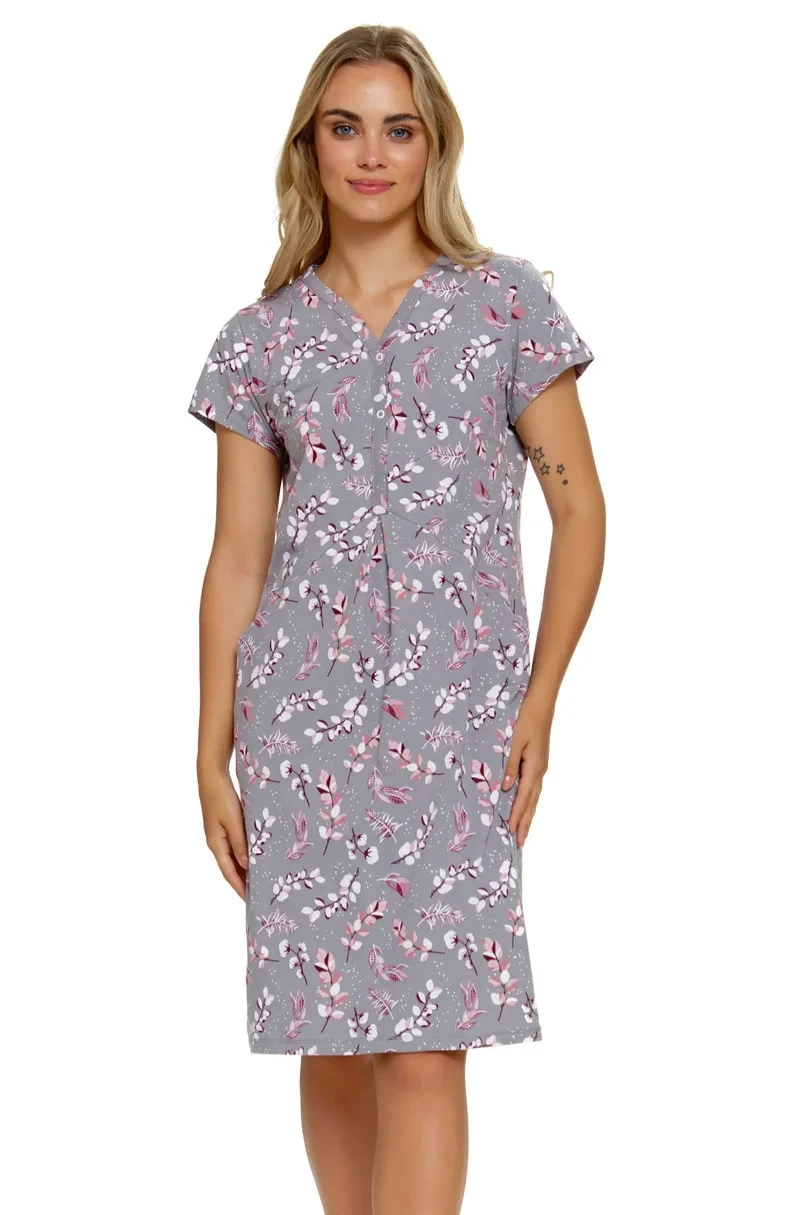 Noční košile s krátkými rukávy ušitá ze vzorované bavlny. Výstřih na knoflíky, řasení na břiše, délka ke kolenům.
