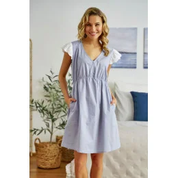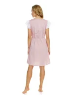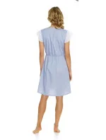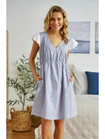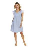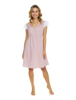 Dámská noční košile šatového střihu s výstřihem a zapínáním na knoflíky. Krátký rukáv pošitý ozdobnou širokou krajkou. Na úrovni boků, kapsy.