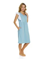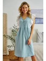 Dámská noční košile šatového střihu s výstřihem a zapínáním na knoflíky. Krátký rukáv pošitý ozdobnou širokou krajkou. Na úrovni boků, kapsy.