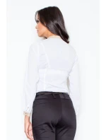 Elegantní a stále módní košile na knoflíky s originálním výstřihem zakončeným stojatým límcem, který jí dodává charakter. Béžové a lesklé knoflíky dělají košili jedinečnou, ideální do práce i na večerní schůzku.