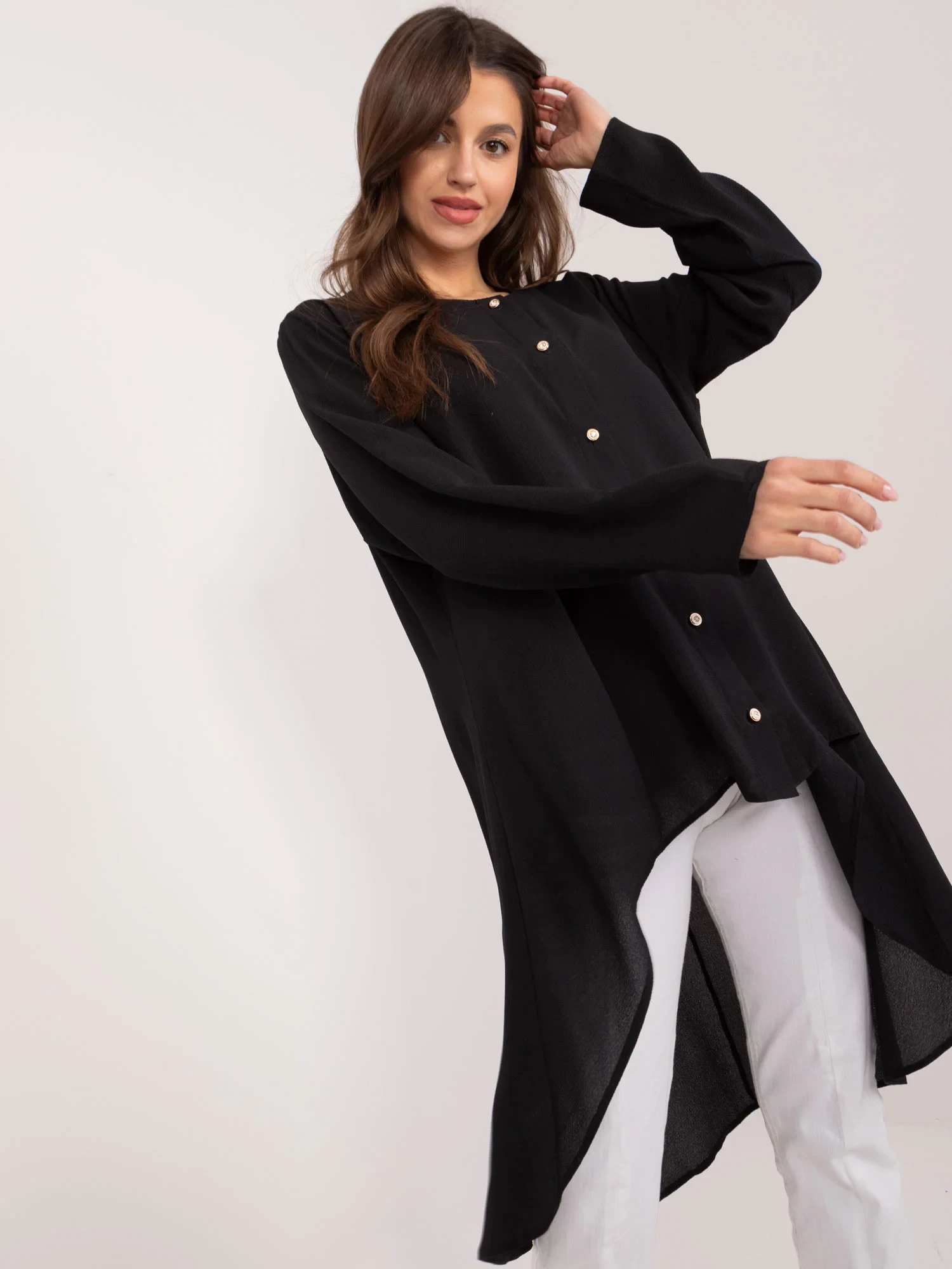 Rozměry košile ve velikosti S/M měřené na plocho: šířka v podpaží - 62 cm, celková délka (vpředu) - 68 cm, celková délka (vzadu) - 104 cm, délka rukávu - 59 cm.
