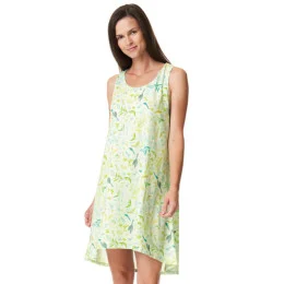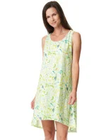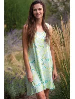 Pohodlná bavlněná noční košile. Ležérní a ženský áčkový tvar s prodlouženou zadní částí. Zelená barva s motivem zahradních bylinó³.