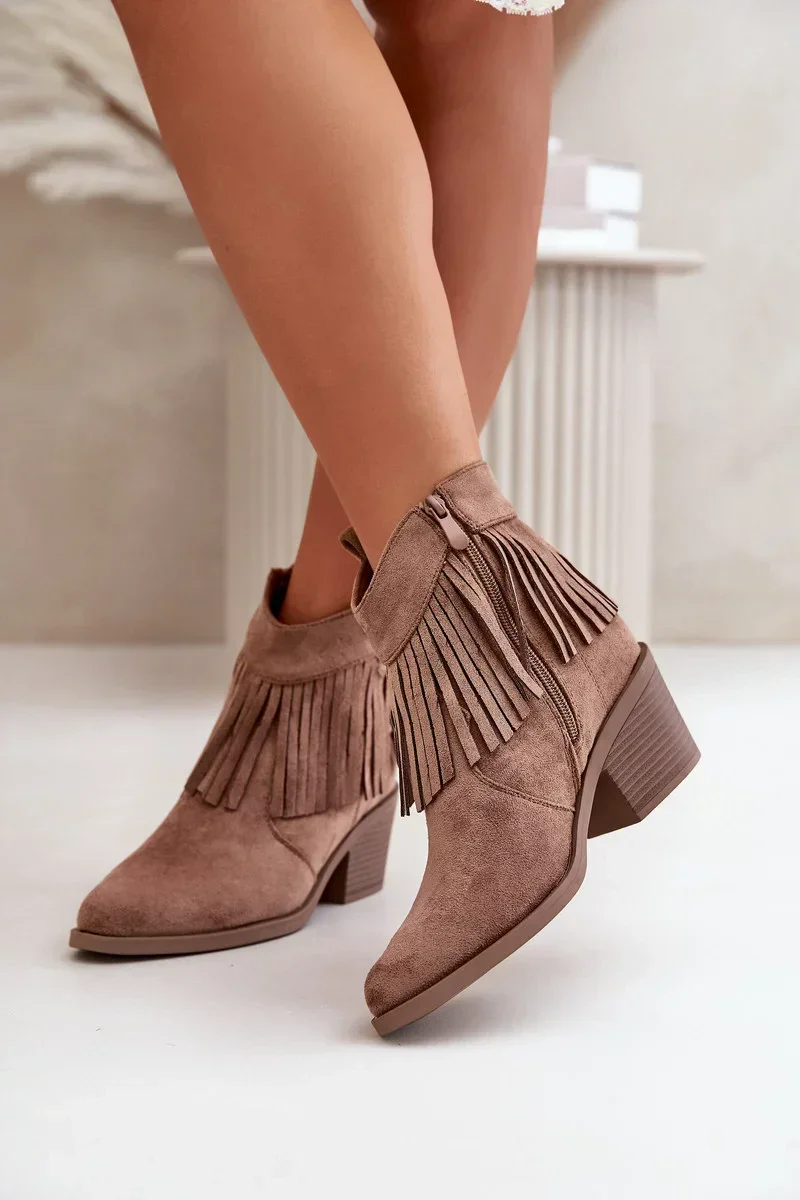 Barski je dokonalé spojení stylu a pohodlí. Vyrobené z vysoce kvalitního eko semiše, tyto kotníkové boty se vyznačují elegantním designem a důrazem na detaily. Zapínání na pohodlný zip, zajišťuje snadné oblékání a svlékání. Svršek zdobený třásněmi jim dodává jedinečnost, což z nich činí skvělou volbu pro různé příležitosti. Špičaté ponožky zdůrazňují elegantní vzhled. Tyto kotníkové boty jsou ideálním doplňkem pro podzimní a zimní outfity, díky kterému se každá žena bude cítit výjimečně. Při výběru velikosti se prosím řiďte tabulkou velikostí.