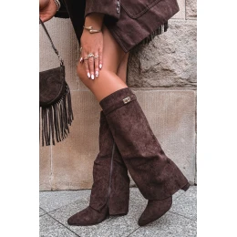 Elegantní dámské kozačky z ekologické semiše. Umístěny na sloupkovém podpatku. Špičaté špičky. Výjimečným prvkem tohoto modelu je ohrnutý lýtkový část s odnímatelným páskem na vrcholu lýtkové části, který přechází na podpatek. Zapínání na zip. Skvělé na nošení s šaty nebo sukněmi! Při výběru velikosti se řiďte tabulkou velikostí.