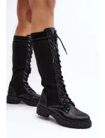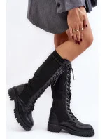 Dámské boty vyrobené z kombinace ekologické kůže a textilního materiálu. Jsou posazené na plochém podpatku. Zaoblená špička. Svršek před kolenem v podobě ponožky. Tento model bude ideální pro mnoho podzimních stylizací! Boty, které musíte mít!