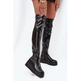 Dámské lakované kozačky vyrobené z ekokože jsou elegantním návrhem na chladné dny. Umístěné na masivní platformě a jemném klínu poskytují stabilitu a pohodlí. Model se zátkou s přidaným zipem na spodní části hole se snadno obouvá a svléká. Zaoblené špičky jim dodávají jemný charakter a vyztužení botníkem na úrovni chodidla zaručuje teplo a pohodlí. Tyto kozačky jsou skvělým doplňkem zimních outfitů, zejména ve spojení s šaty a sukněmi.