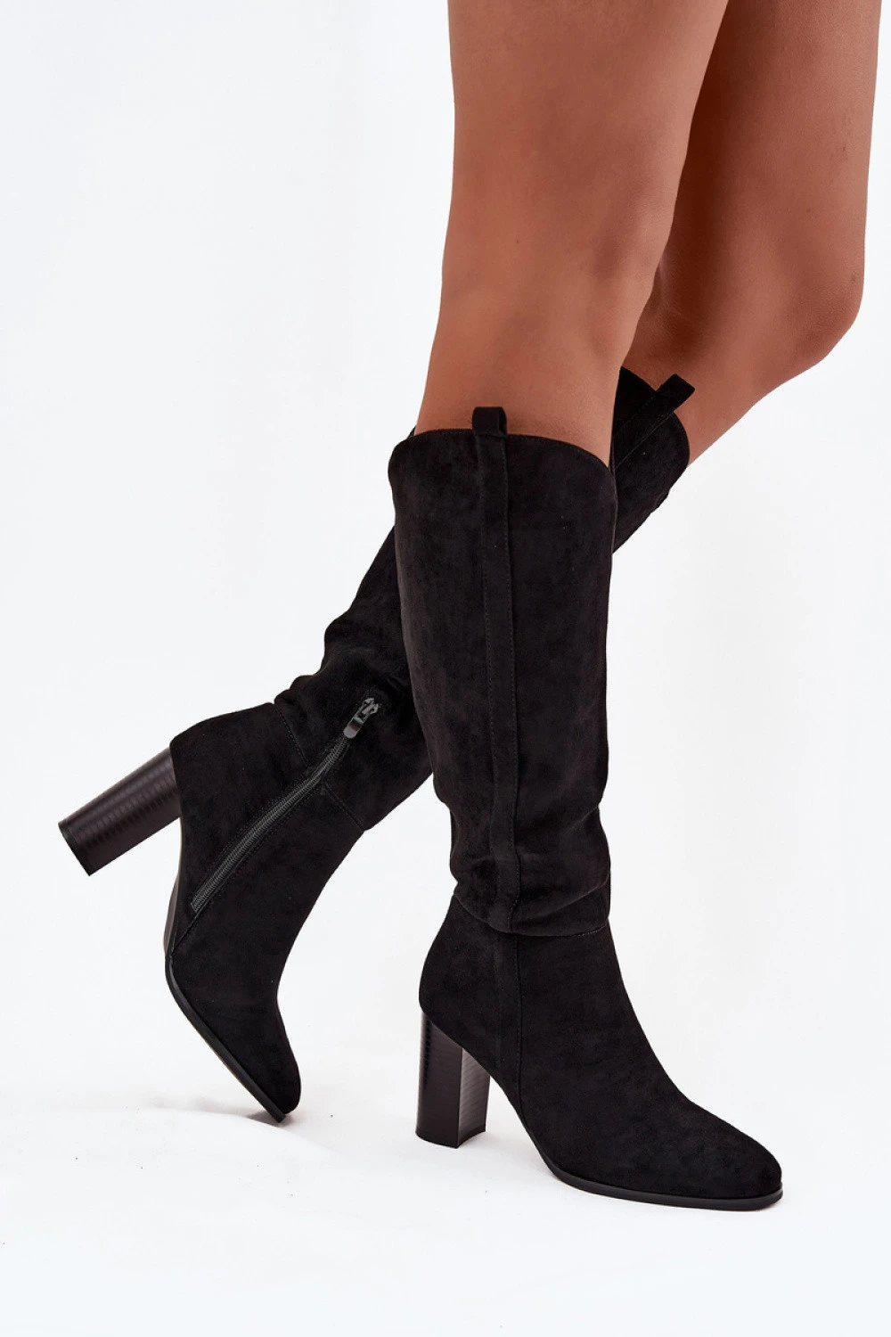 Dámské kozačky vyrobené z ekosuede jsou elegantní nabídkou na chladnější dny. Model s natahovacím zipem umístěným v dolní části holek usnadňuje obouvání a svlékání. Díky stabilnímu podpatku typu sloupek poskytuje pohodlí při chůzi a zároveň jemně zdůrazňuje siluetu. Zaoblené špičky dodávají celku klasický charakter. Jsou to univerzální kozačky, které skvěle doplní různé styly, skvěle vypadají jak s šaty a sukněmi, tak s přiléhavými kalhotami typu skinny, přidávají ženskost a eleganci každému outfitu.