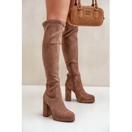 Kozačky na podpatku a platformě s vysokou holenní částí nad koleno, z eko semiše, tmavě béžové Zistaria