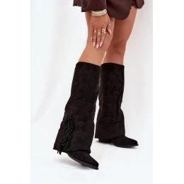 Zasunuté cowboyové kozačky z ekokožešiny na sloupkovém podpatku jsou spojením pohodlí a stylu. Špičaté špičky přidávají eleganci a hřídel zdobená franžemi přináší lehký boho akcent. Ideální pro každodenní stylizace, skvěle ladí s šaty, sukničkami a kalhotami, dodávají každému outfitu kousek kovbojského kouzla.