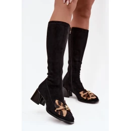 Dámské kozačky vyrobené z měkkého ekokoženého materiálu. Model se zapínáním na zip poskytuje pohodlí při nošení, stabilní blokový podpatek zaručuje pohodlí během nošení. Boty se vyznačují ozdobnou mašlí s zlatým prvkem vpředu, která jim dodává výjimečný ženský charakter. To je skvělá volba pro ženy, které si cení jemných detailů a elegantního vzhledu, ideální jak k sukním, tak k přiléhavým kalhotám nebo šatům.