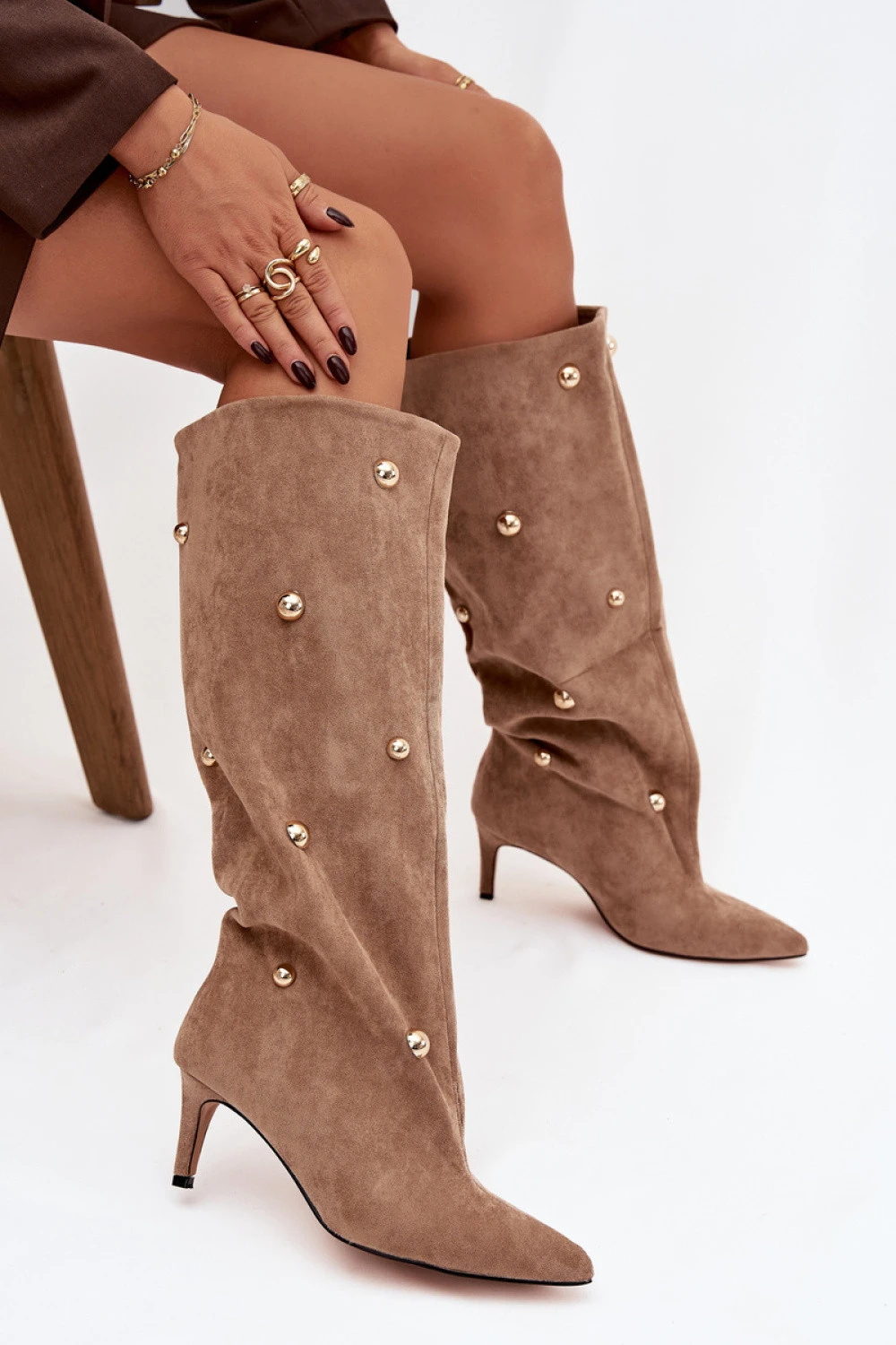 Dámské kozačky vyrobené z ekokože. Štíhlý podpatek a špičaté špičky krásně zjemňují siluetu, zdůrazňujíce ženský charakter obuvi. Model se snadno obouvá, a zlaté ozdoby dodávají výjimečný akcent. Jsou to ideální kozačky na speciální příležitosti a večerní stylizace, které vás vyznačí elegancí a stylovým vzhledem.