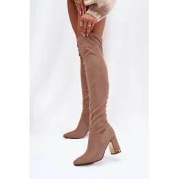 Dámské kozačky z ekokože jsou elegantní model, který se skvěle hodí na chladnější dny. Umístěné na stabilním sloupkovém podpatku vypadají stylově a dodávají postavě lehkost. Vysoký kožený svršek sahající za kolena krásně zdůrazňuje nohy a špičaté špičky dodávají ženský a zúžující efekt. Vnější část je vyztužena koženým kocou na úrovni chodidla, což zaručuje pohodlí a teplo při nošení. Jedná se o skvělou volbu k šatům, sukním a přiléhavým kalhotám, ideální na podzimně-zimní stylizace.
