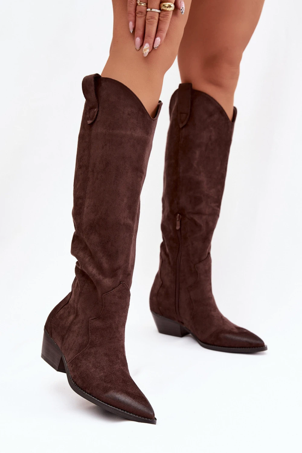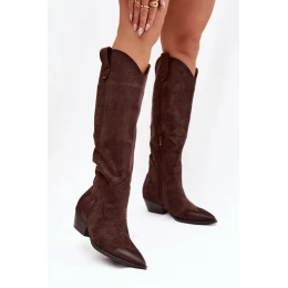 Stylové dámské kozačky kovbojky z ekosuede jsou absolutním hitem sezóny! Model na špičatém podpatku dokonale zdůrazňuje nohu a dodává stylizaci charakter. Boty se zasunují a další zip dole usnadňuje obutí. Vyrobené z měkkého ekosuede skvěle zapadají do moderních, ležérních looků, skvěle vypadají s šaty, sukněmi a skinny džíny.