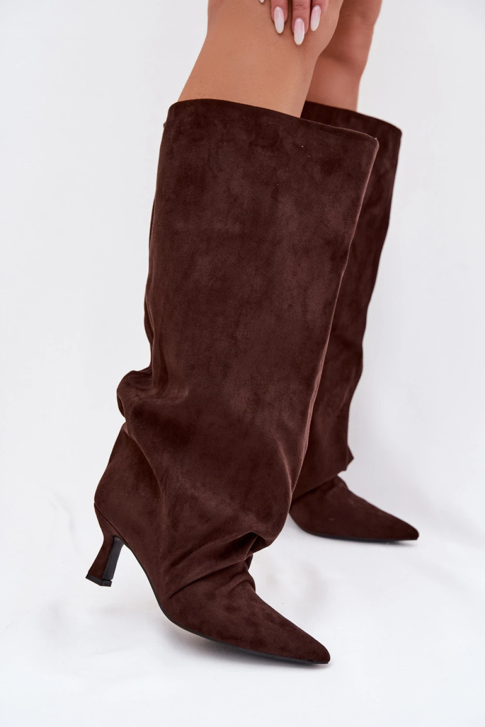 Dámské kozačky vyrobené z ekosuede jsou stylovým návrhem pro ženy, které si cení výrazných detailů. Model vyniká širokou, zahnukanou šachtou, která dává botám módní charakter a přitahuje pozornost. Klenutý podpatek decentně zjemňuje postavu a špičaté špičky zdůrazňují elegantní linii boty. Přetažený střih zajišťuje pohodlí a usnadňuje obouvání, což z kozaček dělá skvělý doplněk do každodenního nošení. Tento efektní obuv je ideální na přechodné období, které skvěle doplní outfity s šaty, sukněmi nebo kalhotami.