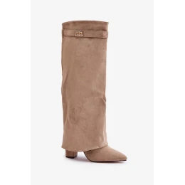 Elegantní dámské kozačky z ekologického semiše. Osazené na podpatku ve tvaru sloupku. Špičaté nosy. Interiér byl zateplen obuvnickou dekou. Výjimečným prvkem tohoto modelu je ohrnutý svršek s odnímatelným páskem na vrchu svršku, který zasahuje na podpatek. Zapínání na zip. Dokonalé k nošení s šaty nebo sukněmi! Při výběru velikosti se prosím řiďte tabulkou velikostí.