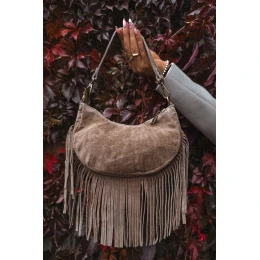 Kožená semišová kabelka s třásněmi tmavě béžová Aurelisse
