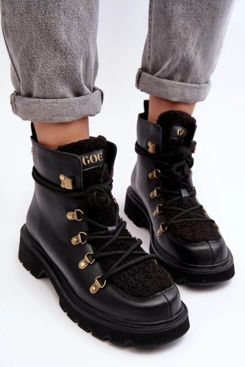 Dámské kotníkové boty značky GOE. Vyrobeno z přírodní kůže. Nasazené na plochém podpatku. Model na šněrování. Přední stranu zdobí kabátek z ovčí kůže. Zaoblené prsty. Vyztužená pata. Uvnitř zateplené dekou na boty. Klasický model, který využijete k mnoha podzimním i zimním stylizacím! Při výběru velikosti se prosím řiďte tabulkou velikostí