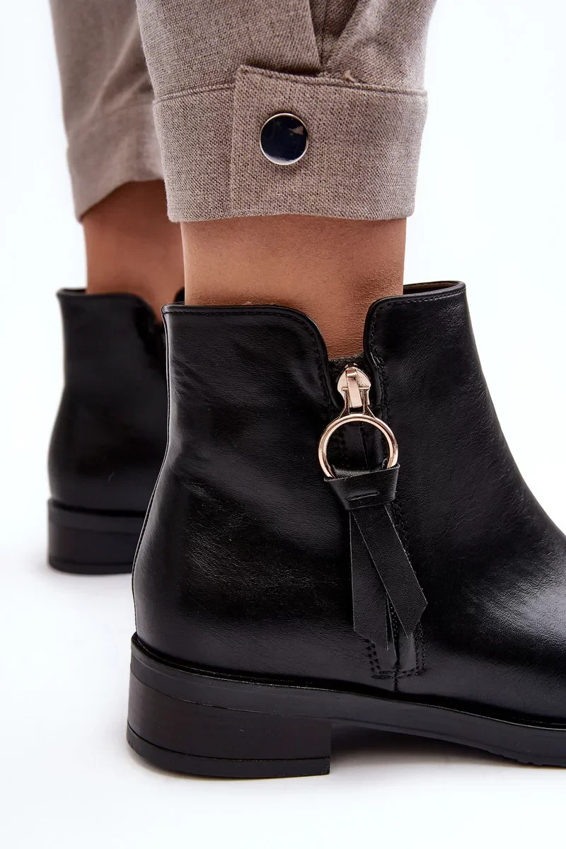 Dámské kotníkové boty vyrobené z eko kůže. Nasazené na plochém podpatku. Svršek se zapíná na zip z vnitřní strany, zatímco druhý zip je ozdobný. Uvnitř je zateplená pěknou dekou na boty. Tento model má navíc vyztuženou patu. Rozhodně byste je měli mít! Při výběru velikosti se řiďte tabulkou velikostí.
