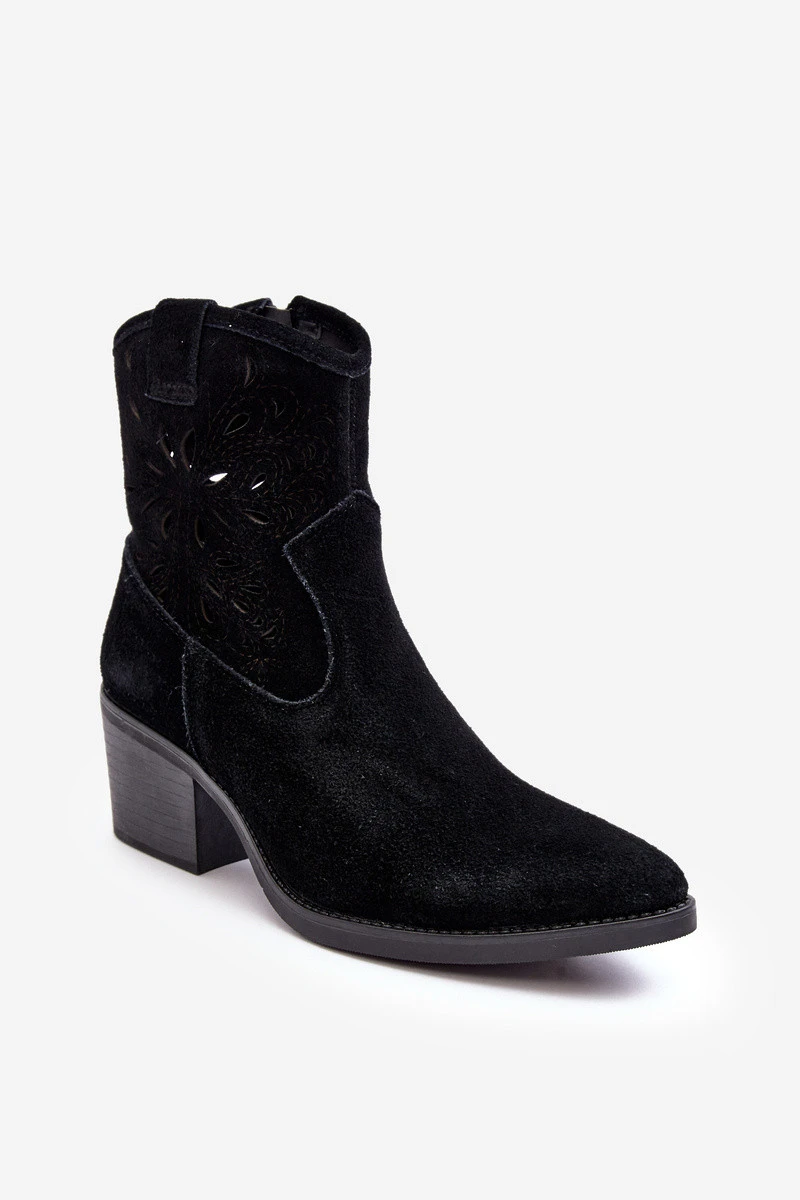Dámské kovbojky jsou vyrobeny z přírodního semiše. Tento model má výšivku po celém obvodu cholewki. Kovbojky jsou na podpatku ve formě sloupku. Tento model je zapínán na zip po straně cholewki. Špička opticky zužuje nohy. Tento model by měl být tvůj!