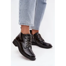 Kožené lakované dámské kotníčkové boty s ozdobným šněrováním D&A MR52-124 Černé