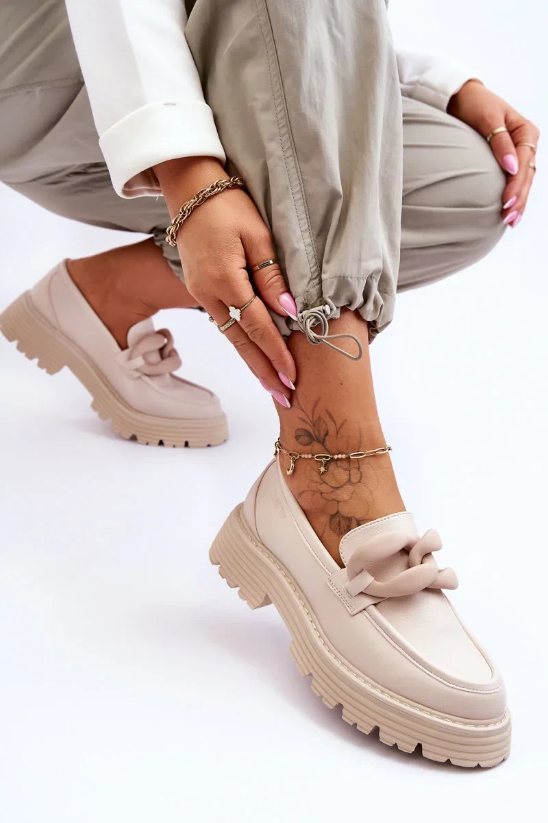 Módní boty - mokasíny jsou vyrobeny z ekologické kůže. Sada na platformě a plochých podpatcích. Mokasíny mají na přední straně ozdobný řetízek. Pohodlné používání obuvi zajistí stélka z ekokůže. Navíc je u těchto bot vyztužený podpatek. Při výběru velikosti se řiďte tabulkou velikostí.
