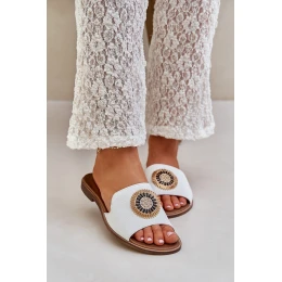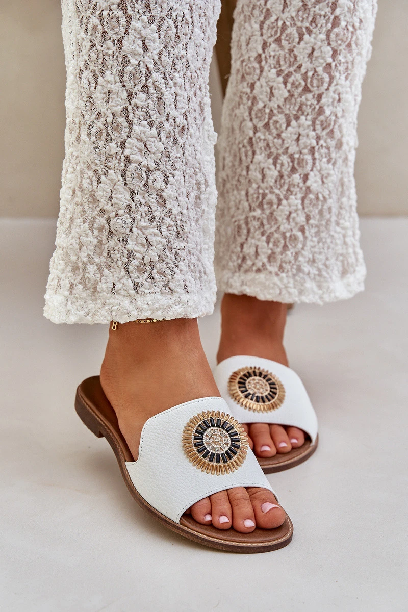 Kožené Pantofle S Dekorací Na Plochém Podpatku Bílé Lewski 3047/O