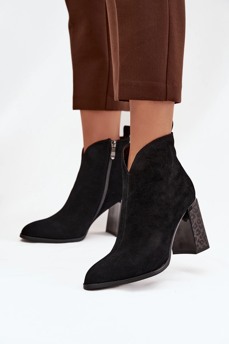 Dámské semišové kotníkové boty představují spojení klasiky s moderním akcentem. Zapínají se na zip, což je činí pohodlné na obouvání i sundávání. Jsou postavené na stabilním podpatku typu sloup s leopardím vzorem, který vyniká originálním vzhledem a přitahuje pozornost. Uvnitř je obuv vyhřátá kožešinou, což zaručuje pohodlí a teplo v chladnějších dnech. Důležitým detailem je prošití podél lýtka, které podtrhu elegantní charakter modelu. Tyto boty jsou ideální pro podzimní a zimní outfity – skvěle se hodí jak na denní nošení, tak do elegantnějších kombinací. Při výběru velikosti se řiďte tabulkou velikostí.