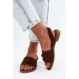Kožené semišové sandály na nízkém podpatku s ozdobným květem Zazoo 407471 Čokoládové