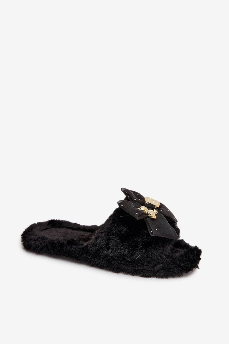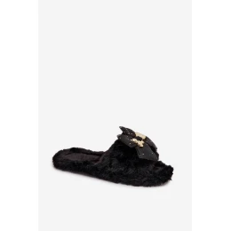 Kožešinové dámské pantofle s mašlí a zlatým zdobením Černé Nolara