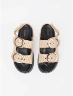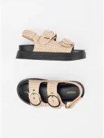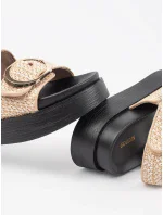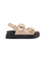 Dámské sandály vyrobené z plastového materiálu, posazené na platformě a jemném klínu, které spojují pohodlí s módním vzhledem. Zapínají se kolem kotníku na sponu s nastavitelným popruhem, což umožňuje dokonalé přizpůsobení noze. Měkká stélka zajišťuje komfort po celý den. Ideální na teplé dny, tyto sandály se skvěle kombinují s šaty, sukněmi a kalhotami, dodávají každému outfitu lehkost. Při výběru velikosti se řiďte tabulkou velikostí.