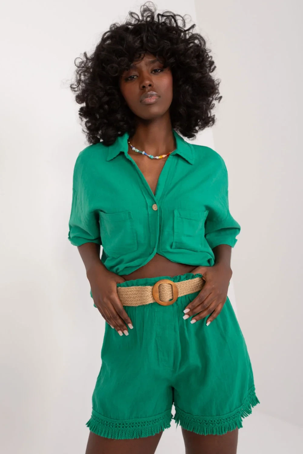 Tyto látkové šortky jsou ideální volbou pro každodenní letní stylizaci a dodají každému outfitu ležérní šarm. Jsou vyrobeny z lehkého lnu s příměsí bavlny a nabízejí prodyšnost a pohodlí i v těch nejteplejších dnech. Jejich široké nohavice s třásněmi dodávají charakter a lehkost a celému outfitu originální vzhled. Stylizované v ležérním duchu se tyto šortky hodí k mnoha různým outfitům. Díky jednobarevnému materiálu jsou univerzální a lze je snadno kombinovat s dalšími kousky ve vašem šatníku. Jejich vysoký střih navíc zdůrazňuje pas a dodává jim ženský nádech. Šortky mají v pase přezku, která vám umožní přizpůsobit si je své siluetě. Tyto šortky, které se skvěle hodí na každodenní procházky, setkání s přáteli nebo letní výlety, budou dokonalým doplňkem vašeho letního šatníku a poskytnou vám styl a pohodlí po celý den.