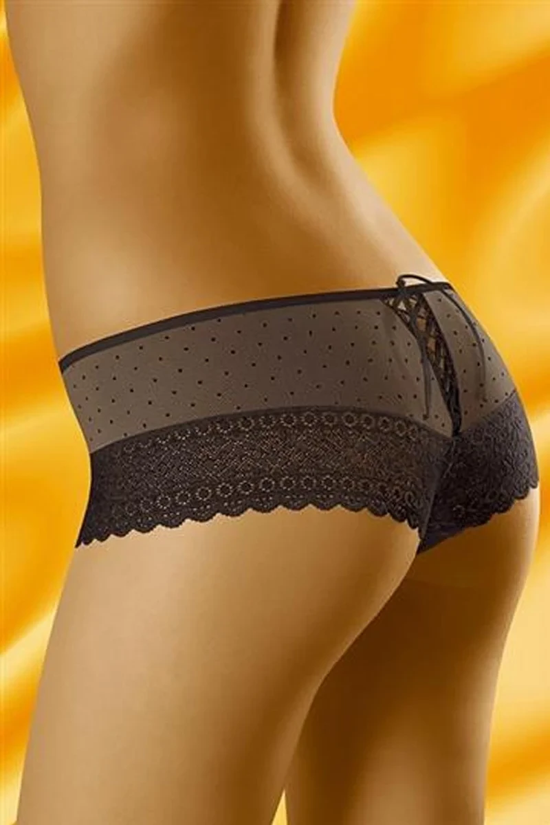 Krásné šortky posypané drobným hráškem. S linií stehen zabalenou do krásné krajky. Sexy šněrování na zádech. Celé mírně průhledné.