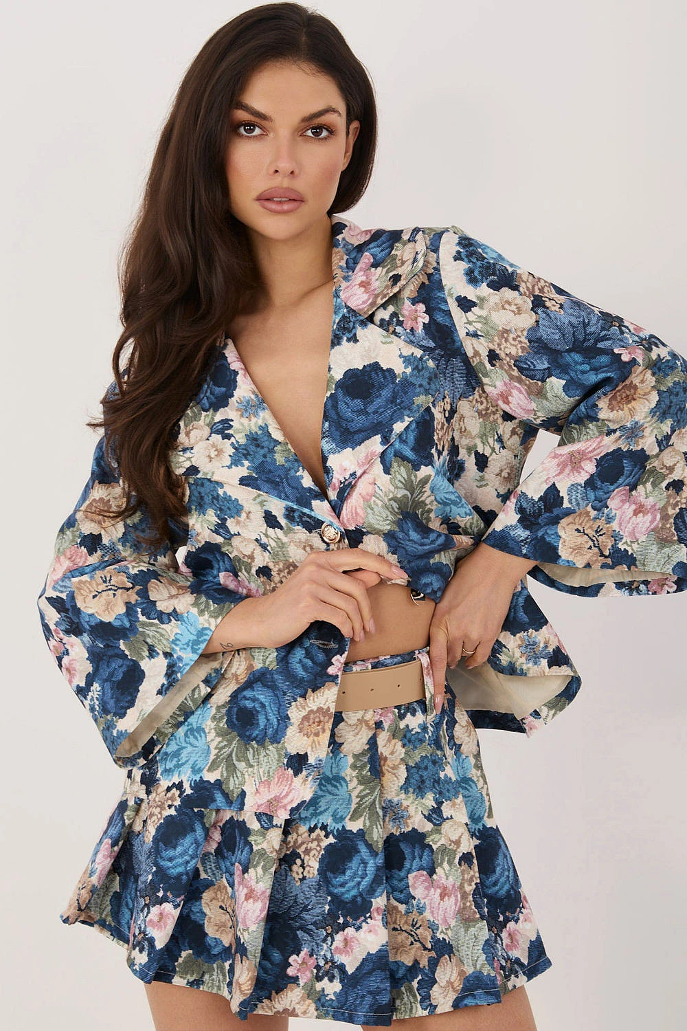Elegantní šortkové sukně s jemným květinovým potiskem, které se skvěle hodí do pracovních stylizací i na společenské příležitosti. Spojují ženský vzhled sukně s pohodlím šortek, zajišťují volnost pohybu a stylový efekt. Vyrobeny z vysoce kvalitní směsi polyesteru a elastanu, zaručují pohodlí při nošení a dobré přizpůsobení postavě. Široké nohavice dodávají lehkost a eleganci, krásně se usazují při pohybu. Model je vybaven elastickým páskem na zadní části, což zvyšuje pohodlí a usnadňuje přizpůsobení. Dále zapínací pásek podtrhuje pás a tvoří stylový akcent. Na přední straně se nachází efektní sukně s záhyby, která celku dodává výjimečný, ženský charakter.