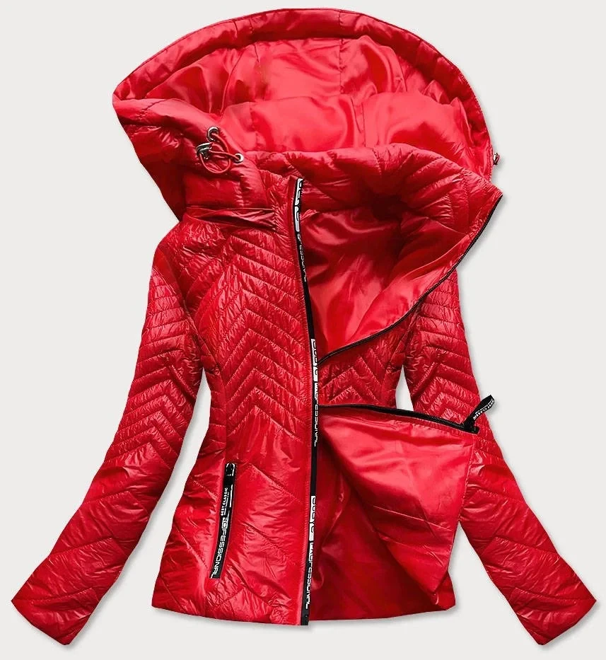 Krátká červená dámská prošívaná bunda s kapucí (B9566)