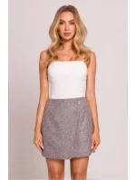 Elegantní minisukně ve tvaru trapezu, vyrobená z vysoce kvalitní látky. Asymetrický střih s ozdobným motivem na přesah dodává sukni výjimečný charakter, zlatý srdcovitý knoflík jemně zdůrazňuje elegantní akcent. Model má skrytý zip po straně, co zajišťuje pohodlí nošení a ideální přiléhavost. Sukně je celá podšitá, co zvyšuje pohodlí a zajišťuje, že se skvěle nosí. Navržena a ušita v Polsku s důrazem na každý detail.