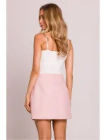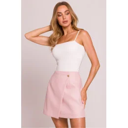 Elegantní minisukně ve tvaru trapezu vyrobená z vysoce kvalitní látky. Asymetrický střih s dekorativním motivem na přeloženém límci jí dodává výjimečný charakter, zlatý srdcovitý knoflík jemně zdůrazňuje elegantní akcent. Model má skrytý zip na straně, co zajistí pohodlí při nošení a dokonalé přizpůsobení. Sukně je celá podšitá, co zvyšuje pohodlí a zajišťuje dokonalé padnutí. Navržena a ušita v Polsku s důrazem na každý detail.