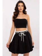 Krátká sukně s asymetrickou přední částí, doplněná páskem na zavazování.