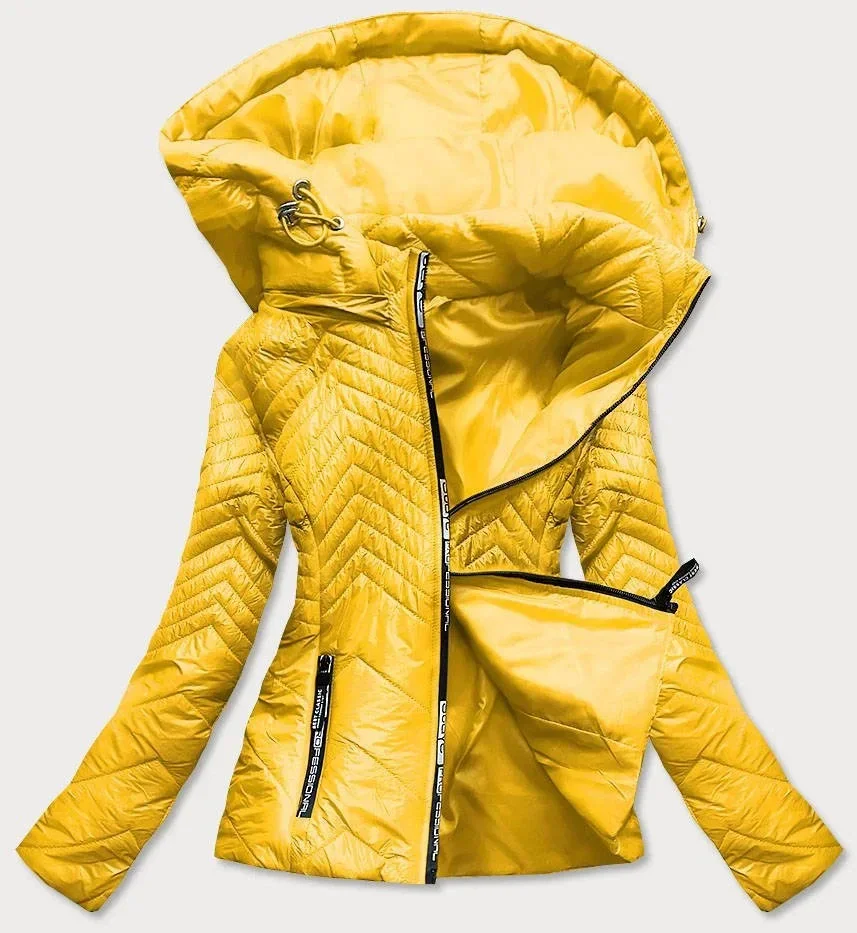 Krátká žlutá prošívaná dámská bunda s kapucí (B9566)