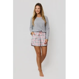 Wygoda, którą poczujesz od pierwszej chwili – damska piżama w ponadczasowym stylu łączy gładką, bawełnianą koszulkę z miękkimi, kratkowymi szortami, tworząc idealny zestaw na spokojny sen i leniwe poranki. Koszulka o długim rękawie, wykonana z przyjemnej w dotyku dzianiny, gwarantuje komfort termiczny i doskonałe dopasowanie dzięki dodatkowi elastanu. Klasyczny, półokrągły dekolt sprawia, że model prezentuje się subtelnie i kobieco. Do kompletu dołączone zostały lekkie spodenki z tkaniny w delikatną kratkę, wykończone elastycznym pasem i uroczą satynową kokardką, która podkreśla ich dziewczęcy charakter. Praktyczne kieszenie po bokach dodają funkcjonalności, czyniąc piżamę idealną także do domowego relaksu. EAN čárové kódy zboží jsou: 5904323277192, 5904323277222, 5904323277239, 5904323277208, 5904323277215