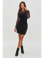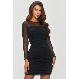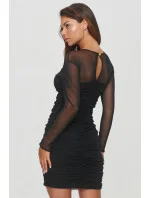 Elegantní, černé šaty s přiléhavým střihem. Šaty jsou krátké, sahají do poloviny stehen, co zdůrazňuje nohy a dodává celku smyslný charakter. Výrazným prvkem této kreace jsou průhledné, dlouhé rukávy a horní část šatů vyrobená z jemné, poloprůhledné síťoviny. Tato průhledná vrstva dodává šatům jemnou eleganci a nádech tajemství, zároveň kontrastujíc s více zastřenou, matnou částí šatů. Model má po celé délce zástřihy, které tvarují siluetu, vytvářejíce efekt štíhlejšího pasu a boků. Další lesk kreaci dodává umístěný vzadu efektní pozlacený knoflík. Šaty mají minimalistický, přiléhavý střih mini, který exponuje nohy a zdůrazňuje siluetu. Celkový vzhled vypadá velmi žensky a moderně, ideální na večerní vycházky, slavnostní události nebo rande, zajišťující elegantní a rafinovaný vzhled. Složení: vnější vrstva: 100% polyester vnitřní vrstva: 94% polyester, 6% elastan