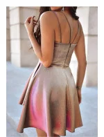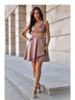 Krátké šaty s tenkými ramínky, zapínání na skrytý zip. Šaty mají hluboký výstřih do tvaru obálky, pasovaný pod prsy, lehce rozšířený spodek na záložku.
