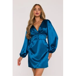 Oslnivý a ženský mini šaty ze saténu, vytvořené s ohledem na ženy, které oceňují eleganci spojenou s moderním stylem. Vyrobena z hladkého, masivního saténu s jemným leskem, krásně odráží světlo a jemně zdůrazňuje siluetu. Model vyniká hlubokým, záhybovým výstřihem ve tvaru srdce, který zdůrazňuje linii krku a dekoltu zmyslným, ale stále elegantním způsobem. Dlouhé, nafouklé rukávy ukončené gumou přidávají lehkost a romantický charakter. V pasu je široký pás s dekorativními knoflíky vpředu a gumou vzadu, která zajistí dokonalé přizpůsobení a pohodlí nošení. Jednoduché, lehce přizpůsobené dno zdůrazňuje ženskou siluetu, zachovávající elegantní rovnováhu. Šaty nemají žádné zapínání ani podšívku, jsou navlékané přes hlavu, což zajišťuje, že zůstávají lehké a pohodlné k nošení. Model byl navržen a ušit v Polsku s důrazem na detaily. Jedná se o elegantní mini šaty ve tvaru záhybu, ideální na večírky, večerní vycházky a speciální příležitosti, kdekoliv se objevíte, okouzlíte saténovým leskem a ženskou formou.