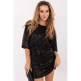 Elegantní šaty s jednoduchým střihem, vybavené pohodlným elastickým pásem, který jemně zdůrazňuje pas a zajišťuje perfektní přizpůsobení. Tento model je určený na večírky a elegantní příležitosti, kde se počítá jak s pohodlím, tak s efektním vzhledem. Šaty jsou vyrobeny z směsi polyesteru a elastanu, díky čemuž se pěkně tvarují podle postavy a poskytují plnou volnost pohybu. Celá plocha materiálu je pokryta třpytivými flitry, které přitahují pohled a dodávají outfitu výjimečný lesk. Další výhodou je podšívka, která zvyšuje pohodlí nošení a zabrání prosvítání. Model má mini délku, klasický kulatý výstřih a pohodlný rukáv 3/4, což dodává celku harmonický a elegantní vzhled. Šaty nemají zapínání, což usnadňuje jejich oblékání a nošení. Ideální volba pro ženy, které chtějí vypadat ohromně a cítit se volně během výjimečných příležitostí.