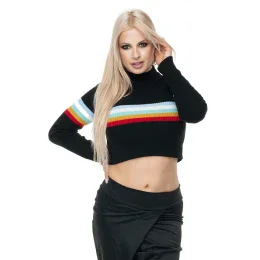 Krátký žebrovaný svetr s rolákem. Svetr s duhovými pruhy z měkké příze.