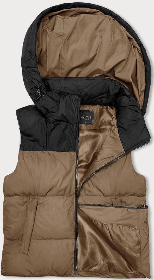 Tmavě béžovo-černá krátká dámská vesta J.STYLE s kapucí (16M9112-84)