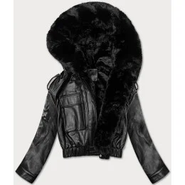 Černá krátká kožená bunda pro přechodné období s kožešinou J Style (11Z8172)