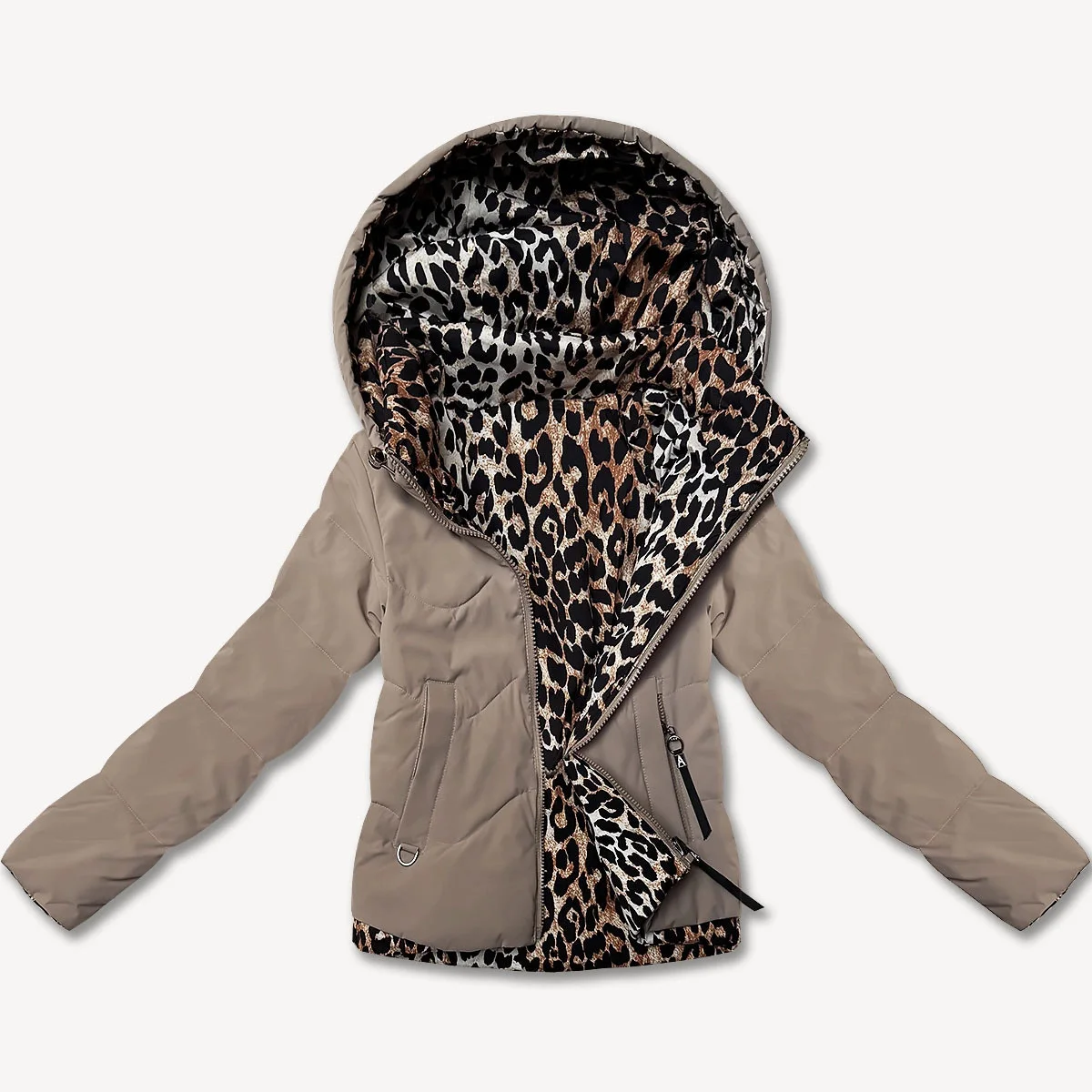 Tmavě béžová krátká volná dámská bunda s panteřím motivem Miss TiTi (25898)