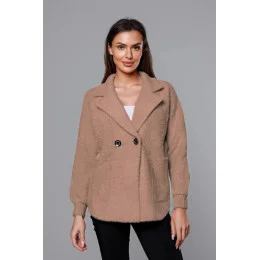 Přehoz je měkký a příjemný na dotyk, má dvě kapsy a zapíná se knoflíkem. Rukávy jsou olemované stahovacími lemy. Model má délku k bokům.